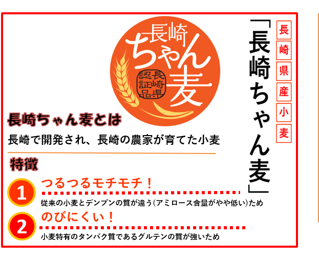 ちゃんぽん用に開発された特別な小麦を使用。つるつるモチモチとした食感が特徴で、グルテンの質が強いため、のびにくいのが魅力です。小麦本来の風味豊かで、めんつゆとの相性も抜群。具材に負けないしっかりとした麺です。釜揚げうどんなどおすすめです!