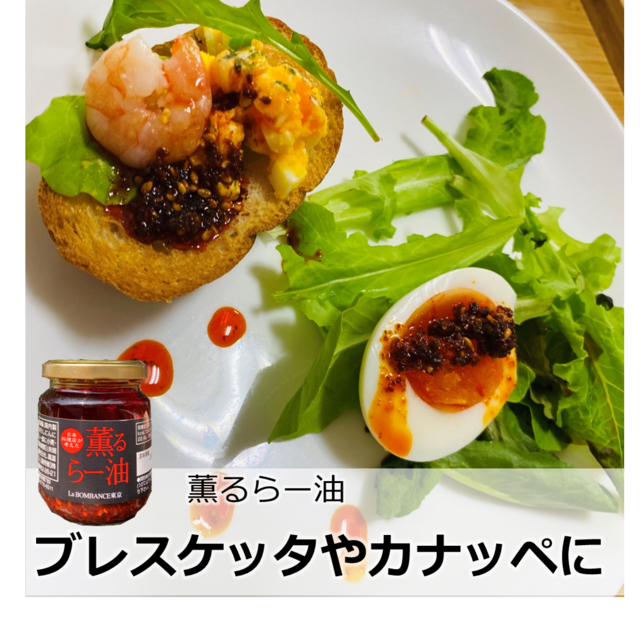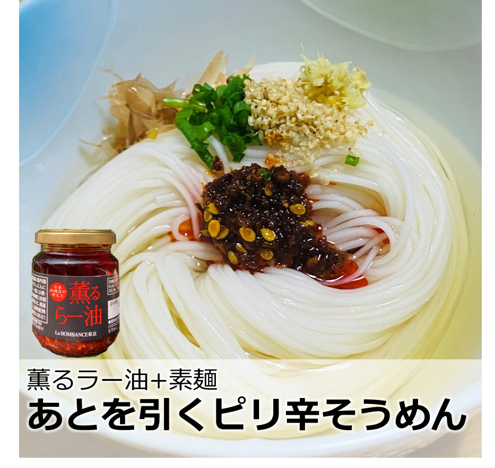 ラ・ボンバンスのオリジナル商品「薫るらー油」、「めんつゆ」を使い色々な食べ方をお楽しみください。